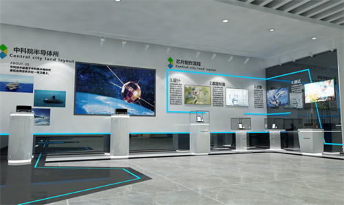 該館展陳面積560平方米,展廳被規(guī)劃出五大區(qū)域,分別是:芯片發(fā)展歷程、企業(yè)概況、產(chǎn)品與應(yīng)用、發(fā)展愿景和工作場景區(qū)。我方提取芯片的發(fā)展概況和科技特點,打造成一個科技展廳,構(gòu)建互動、交互、體驗的高端平臺,營造一種沉浸式體驗。