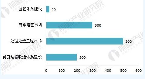 根據(jù)前瞻產(chǎn)業(yè)研究院發(fā)布的《2018-2023年中國餐廚垃圾處理行業(yè)發(fā)展前景預(yù)測與投資戰(zhàn)略規(guī)劃分析報(bào)告》預(yù)計(jì),“十三五”期間整個(gè)餐廚垃圾總體市場空間可達(dá)1000-1500億元。其中餐廚垃圾收運(yùn)體系建設(shè)約需200億(收運(yùn)體系其中包括垃圾容器、車輛,包括車輛和垃圾容器之間的銜接)、處理處置工程市場約需500-1000億、日常運(yùn)營市場大約是300億、監(jiān)管體系建設(shè)大約能形成20億左右的市場規(guī)模。