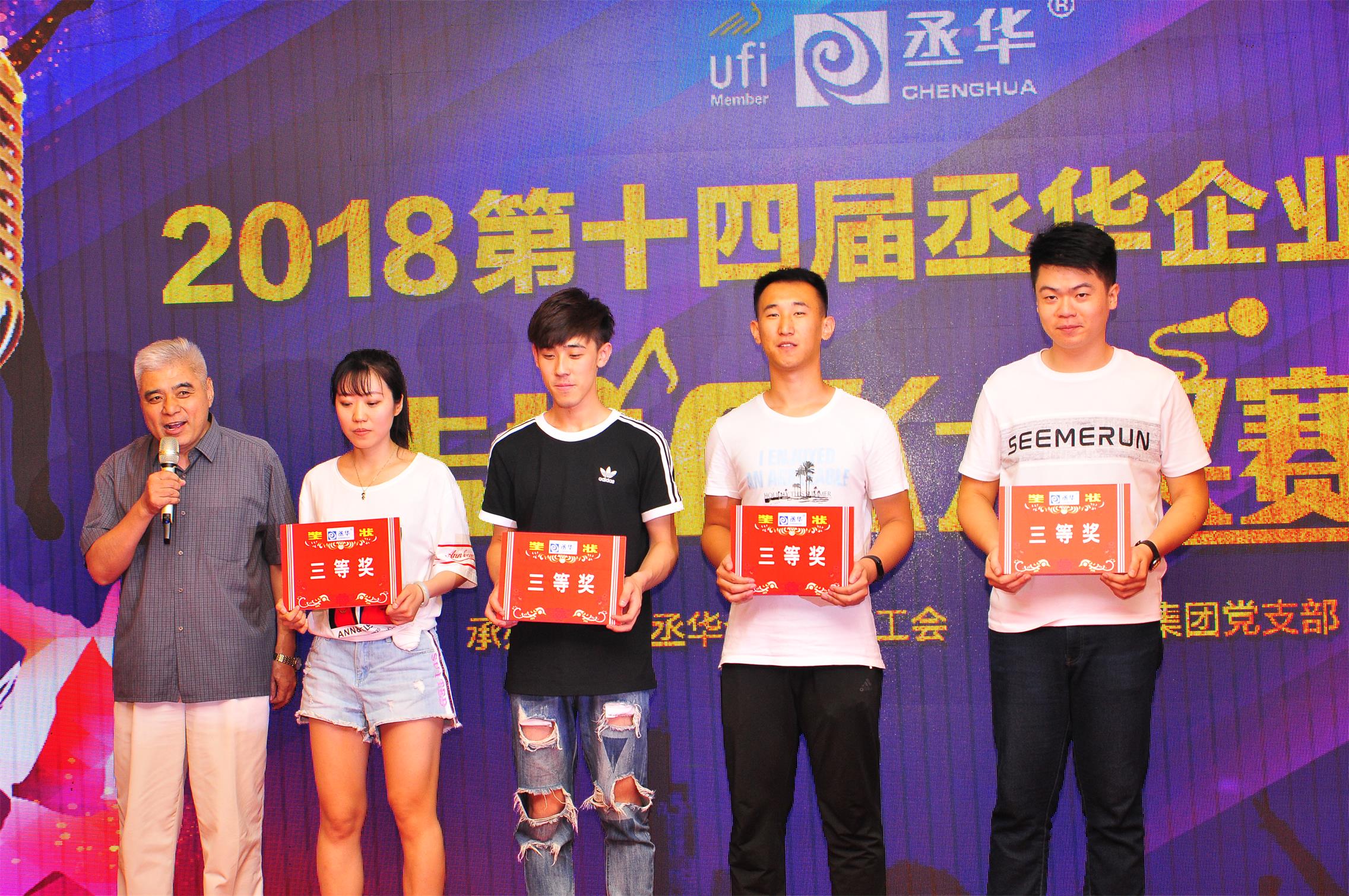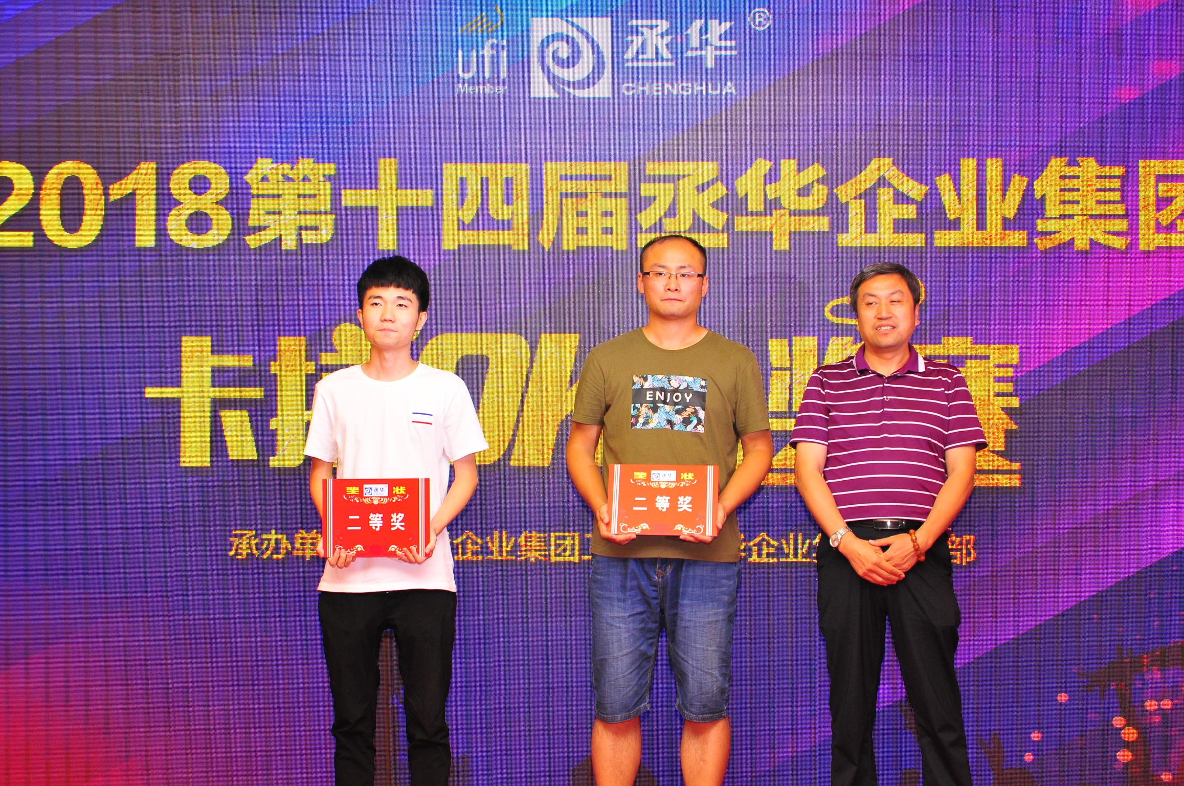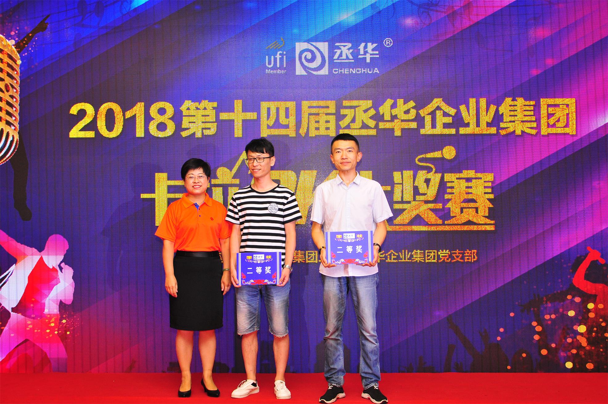 最終,經(jīng)過緊張激烈的角逐,來自丞華展覽項(xiàng)目五組的孫浩憑借一首《男孩》奪得青春派冠軍,項(xiàng)目五組李廣、會議二部劉中旭分別獲得青春派二等獎,會議二部張鵬、張寬、會議一部任書賡、財(cái)務(wù)中心趙玉賢分別獲得青春派三等獎。而丞華展覽公司行政部的侯兆芳憑現(xiàn)場精彩演繹的《勇氣》一曲問鼎桂冠,獲得少壯派一等獎,市場部朱雷、直屬項(xiàng)目二組王奇分別獲得少壯派二等獎,項(xiàng)目七組張曉斌、張麗麗、丞華建材公司曹新紅分別獲得少壯派三等獎。