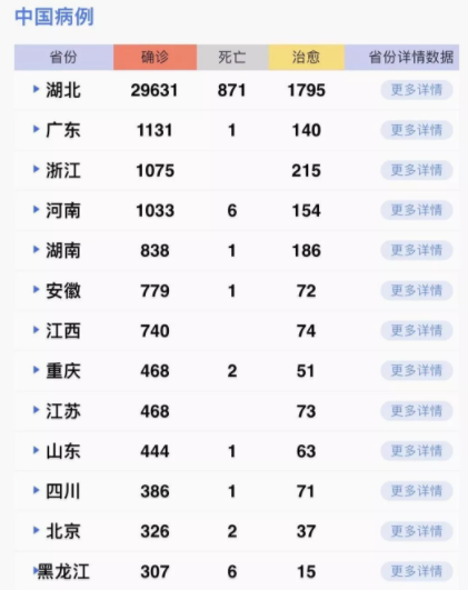 據(jù)31個(gè)?。ㄗ灾螀^(qū)、直轄市)和新疆生產(chǎn)建設(shè)兵團(tuán)報(bào)告,現(xiàn)有確診病例35982例(其中重癥病例6484例),累計(jì)治愈出院病例3281例,累計(jì)死亡病例908例,累計(jì)報(bào)告確診病例40171例(湖北核減87例,江西、甘肅各核減1例),現(xiàn)有疑似病例23589例。累計(jì)追蹤到密切接觸者399487人,尚在醫(yī)學(xué)觀察的密切接觸者187518人。