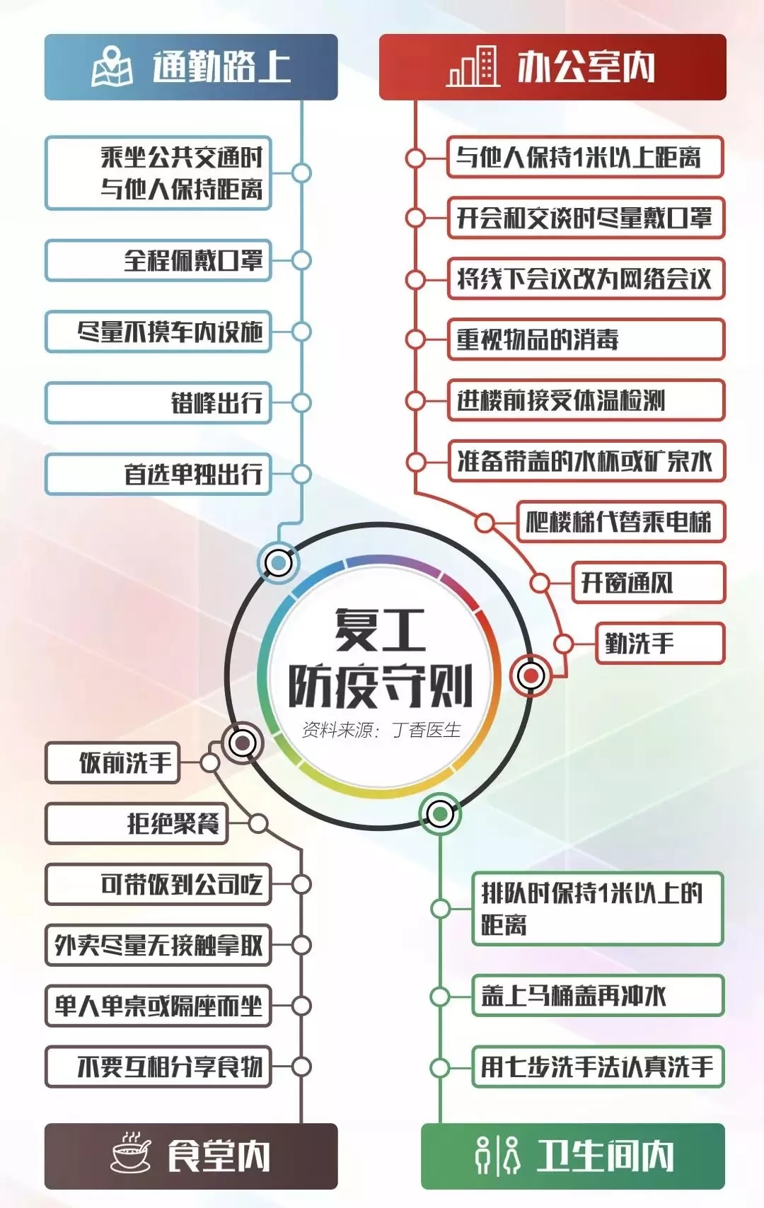 本周,不少人已開啟節(jié)后復(fù)工模式 通勤路上如何防護(hù)? 辦公室里要注意哪些細(xì)節(jié)? 在食堂用餐應(yīng)規(guī)避哪些風(fēng)險(xiǎn)? 收好下面這份復(fù)工防疫守則 關(guān)鍵信息一目了然↓↓↓