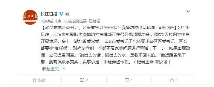 【武漢要求區(qū)委書(shū)記、區(qū)長(zhǎng)要簽訂“責(zé)任狀” 疫情防控出現(xiàn)疏漏 追責(zé)問(wèn)責(zé)】2月19日晚,武漢市新冠肺炎疫情防控指揮部正在召開(kāi)視頻調(diào)度會(huì),調(diào)度3天拉網(wǎng)大排查開(kāi)展情況。會(huì)上,湖北省委常委、武漢市委書(shū)記王忠林要求各區(qū)區(qū)委書(shū)記、區(qū)長(zhǎng)都要簽“責(zé)任狀”,對(duì)確診病例一個(gè)都不居家等問(wèn)題進(jìn)行承諾,下一步,如果出現(xiàn)疏漏,立馬追責(zé)問(wèn)責(zé)。“說(shuō)出去的話(huà),潑出去的水,是收不回來(lái)的。”他提醒各級(jí)干部,要確保數(shù)字真實(shí),實(shí)事求是,不能弄虛作假。(記者王雪 鄭汝可)