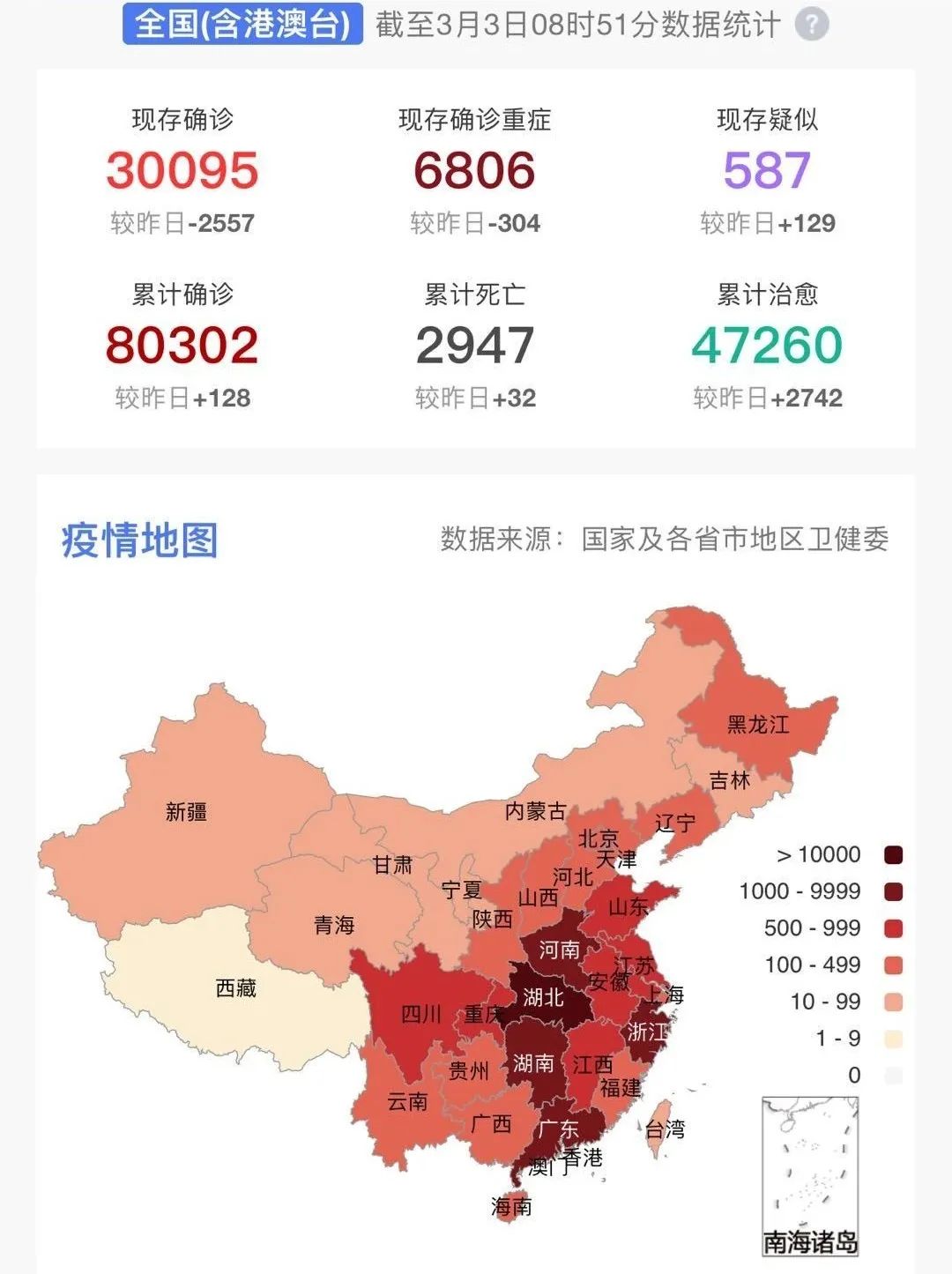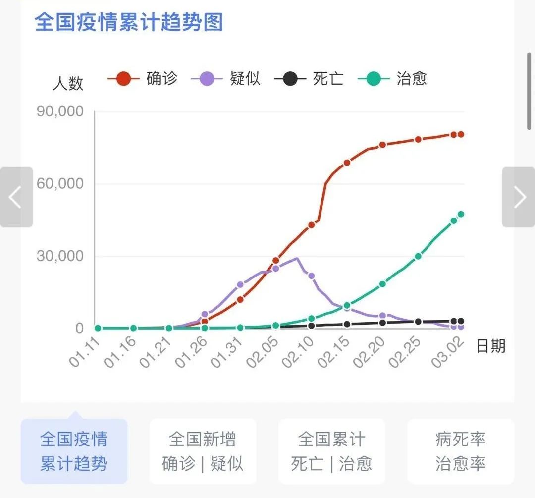 據(jù)31個(gè)?。ㄗ灾螀^(qū)、直轄市)和新疆生產(chǎn)建設(shè)兵團(tuán)報(bào)告,現(xiàn)有確診病例30004例(其中重癥病例6806例),累計(jì)治愈出院病例47204例,累計(jì)死亡病例2943例,累計(jì)報(bào)告確診病例80151例,現(xiàn)有疑似病例587例。累計(jì)追蹤到密切接觸者664899人,尚在醫(yī)學(xué)觀察的密切接觸者40651人。