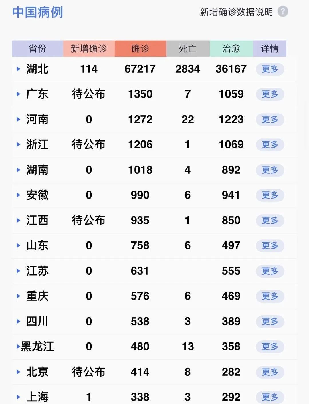 湖北新增確診病例114例(武漢111例),新增治愈出院病例2410例(武漢1846例),新增死亡病例31例(武漢24例),現(xiàn)有確診病例28216例(武漢24144例),其中重癥病例6593例(武漢6020例)。累計(jì)治愈出院病例36167例(武漢23031例),累計(jì)死亡病例2834例(武漢2251例),累計(jì)確診病例67217例(武漢49426例)。新增疑似病例64例(武漢62例),現(xiàn)有疑似病例434例(武漢316例)。