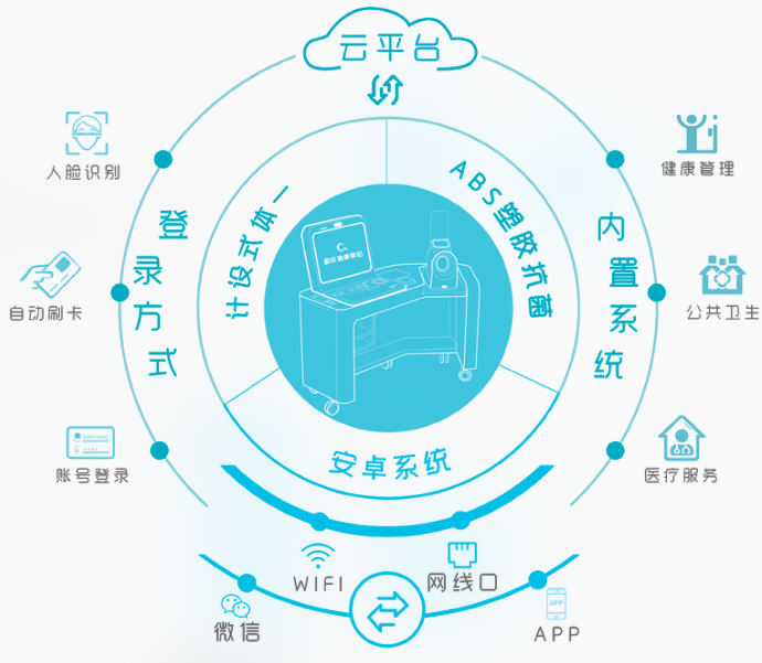 勤成“健康驛站”應由設備主機與配套的醫(yī)療檢測設備組成。產品設計符合醫(yī)療健康“互聯(lián)網(wǎng)”化的需求,采用一體式設計,ABS塑膠抗菌材質,安卓系統(tǒng),集成度高。檢測設備多樣且簡便易用,操作流程清晰并具備相應的語音引導,社區(qū)居民可輕松使用。 “驛站”軟件平臺應基于安卓系統(tǒng),可以便捷的實現(xiàn)平臺維護與功能升級。軟件平臺對WIFI、4G通訊應具有良好的支持,可以方便通過微信、居民健康APP等向用戶推送健康資訊與數(shù)據(jù)。