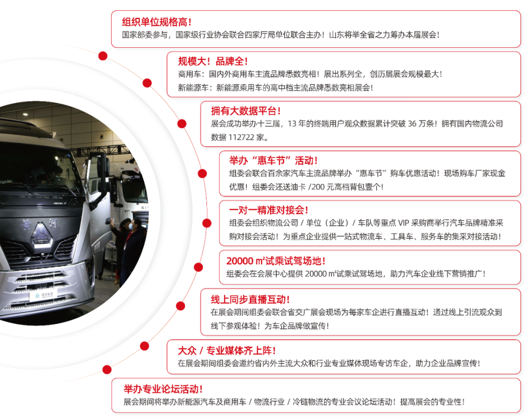 “山東國際汽車工業(yè)博覽會”自2008年舉辦以來,累計展覽面積達24萬平方米,服務(wù)參展企業(yè)1500余家,接待觀眾人數(shù)25萬人。歷屆展會吸引了斯堪尼亞、沃爾沃、曼、奔馳、中國重汽、一汽解放、一汽青島、福田戴姆勒、上汽依維柯紅巖、陜汽、東風商用、東風柳汽、福田汽車、廣汽日野、江淮、濰坊凱馬、淄博唐駿歐鈴、開瑞綠卡、躍進、江淮、中集、青特、上汽大通、江鈴、慶鈴、中通客車、長安汽車、鄭州日產(chǎn)、上汽通用五菱、浙江飛碟、日照中興、山汽制造、青島中汽特種車、山東中材大力專用車、山東三星機械、匯海汽車、豪瑞通、中魯特、東岳專用車、楊嘉專用車等國內(nèi)外知名的重中輕卡和專用車品牌企業(yè)參展。山東汽車工業(yè)博覽會已經(jīng)成為行業(yè)內(nèi)重要展會之一,博覽會的舉辦對促進國內(nèi)汽車工業(yè)的發(fā)展與市場開拓和合作交流發(fā)揮了重要的推動作用。