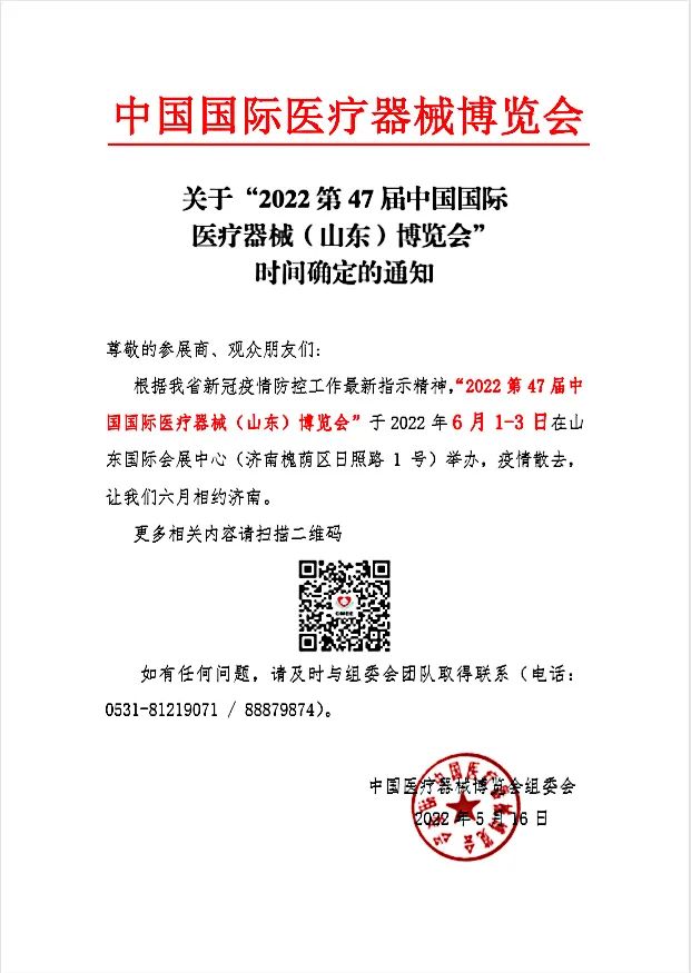 根據(jù)我省新冠疫情防控工作最新指示精神,“2022第47屆中國國際醫(yī)療器械(山東)博覽會”于2022年6月1-3日在山東國際會展中心(濟南槐蔭區(qū)日照路1號)舉辦,疫情散去,讓我們六月相約濟南。