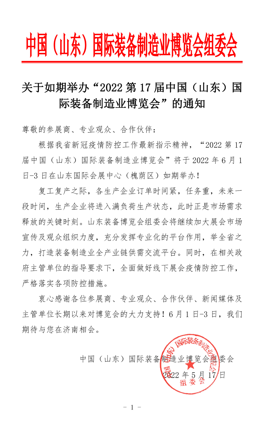 根據(jù)我省新冠疫情防控工作最新指示精神,“2022第17屆中國(guó)(山東)國(guó)際裝備制造業(yè)博覽會(huì)”將于2022年6月1日-3日在山東國(guó)際會(huì)展中心(槐蔭區(qū))如期舉辦!
