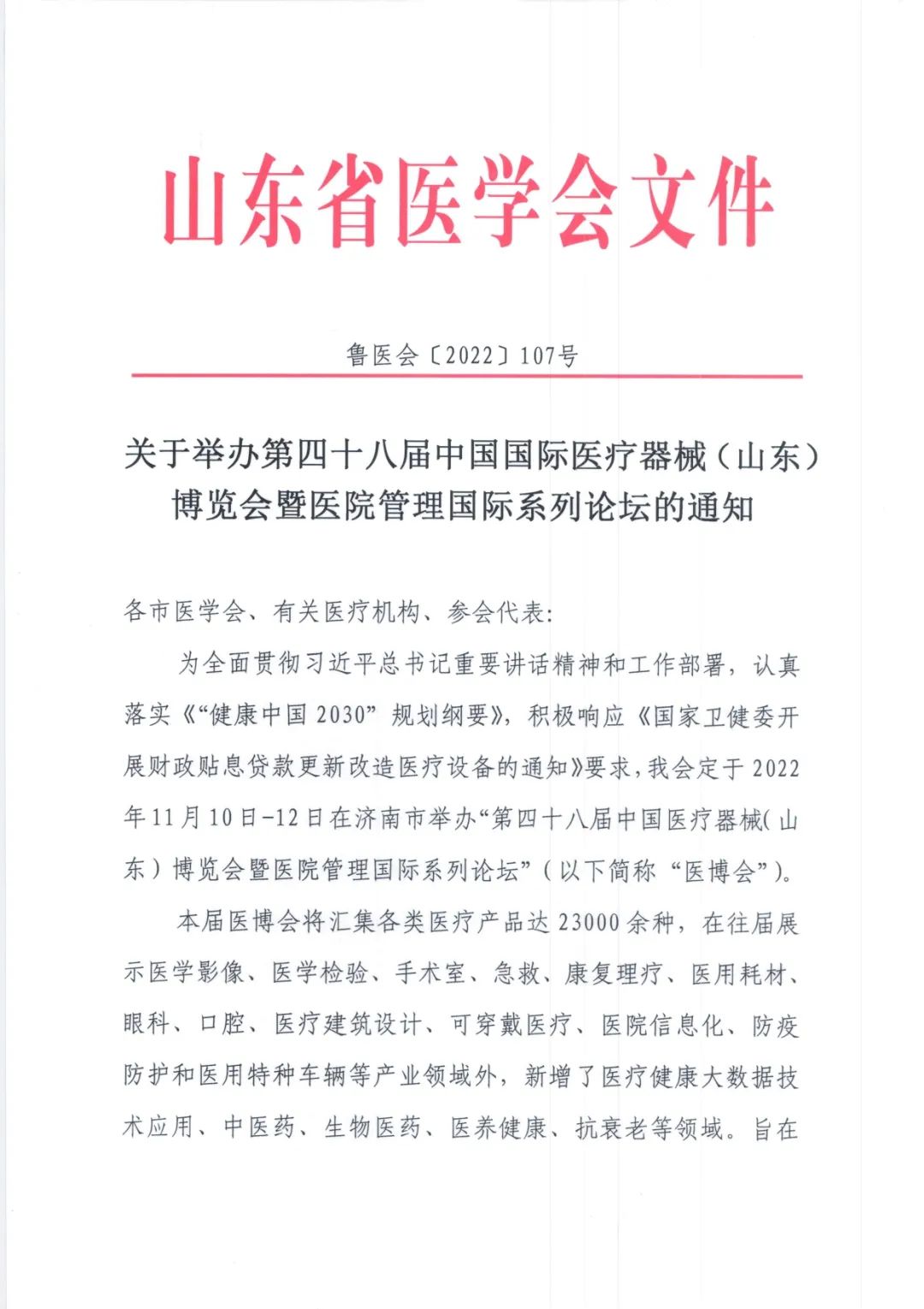 關(guān)于舉辦第四十八屆中國(guó)國(guó)際醫(yī)療器械(山東)博覽會(huì)暨醫(yī)院管理國(guó)際系列論壇的通知