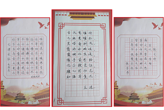 以史為鑒,可知興替;以詩為馬,莫負(fù)韶華。本次參加活動的黨員們用堅(jiān)定的筆觸,澎湃的心情重溫革命語錄、抄寫紅色詩詞,字里行間深切地感受黨的光輝發(fā)展歷程。書寫的作品結(jié)構(gòu)均勻,筆畫流暢,橫平豎直整齊美觀,落筆之處或輕或重,或緩或急,橫、豎、撇、捺、點(diǎn)間,可以看出大家的認(rèn)真態(tài)度。“紅軍不怕遠(yuǎn)征難,萬水千山只等閑”、“雄心寫壯志,和諧奔復(fù)興”、“漫天風(fēng)雪滿天愁,革命何須怕斷頭”、“雄關(guān)漫道真如鐵,而今邁步從頭越”……從一篇篇的抄錄作品中,我們仿佛又看到了中國共產(chǎn)黨那段艱苦卓絕的奮斗歷程,體會了革命先烈不屈不撓、英勇頑強(qiáng)的大無畏氣概。