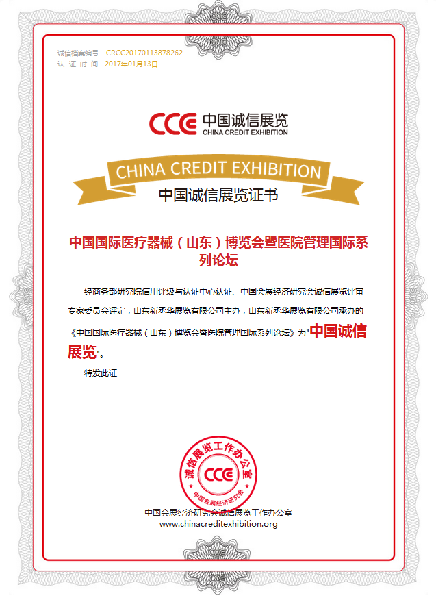 特大喜訊:近日,經(jīng)商務(wù)部研究院信用評(píng)級(jí)與認(rèn)證中心認(rèn)證、中國(guó)會(huì)展經(jīng)濟(jì)研究會(huì)誠(chéng)信展覽評(píng)審專(zhuān)家委員會(huì)評(píng)定,由山東新丞華展覽有限公司(簡(jiǎn)稱(chēng):丞華展覽)主承辦的“中國(guó)國(guó)際醫(yī)療器械(山東)博覽會(huì)暨醫(yī)院管理國(guó)際系列論壇(簡(jiǎn)稱(chēng):醫(yī)博會(huì))”被評(píng)定為“中國(guó)誠(chéng)信展覽”,這是山東首個(gè)展覽項(xiàng)目榮獲此類(lèi)國(guó)家級(jí)權(quán)威認(rèn)證。