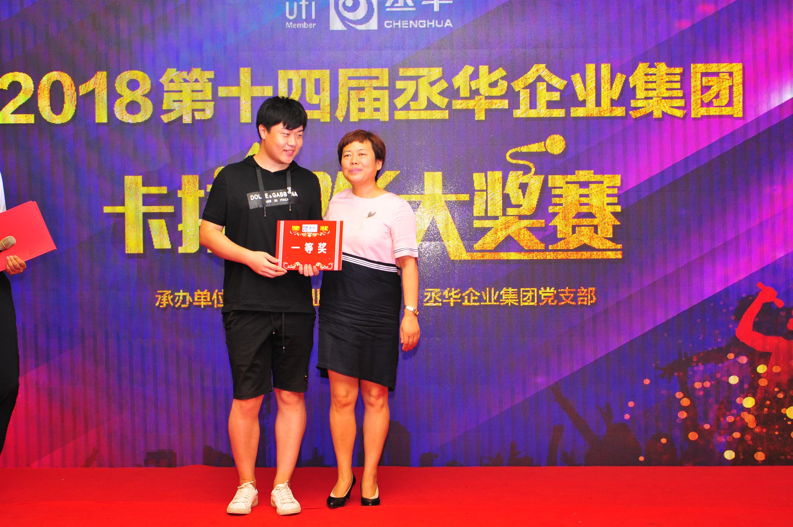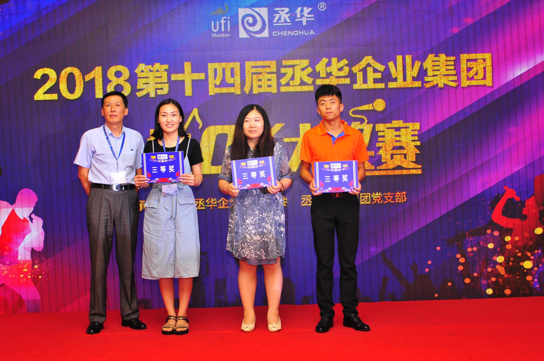 最終,經(jīng)過緊張激烈的角逐,來自丞華展覽項(xiàng)目五組的孫浩憑借一首《男孩》奪得青春派冠軍,項(xiàng)目五組李廣、會議二部劉中旭分別獲得青春派二等獎,會議二部張鵬、張寬、會議一部任書賡、財(cái)務(wù)中心趙玉賢分別獲得青春派三等獎。而丞華展覽公司行政部的侯兆芳憑現(xiàn)場精彩演繹的《勇氣》一曲問鼎桂冠,獲得少壯派一等獎,市場部朱雷、直屬項(xiàng)目二組王奇分別獲得少壯派二等獎,項(xiàng)目七組張曉斌、張麗麗、丞華建材公司曹新紅分別獲得少壯派三等獎。