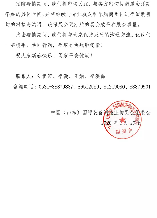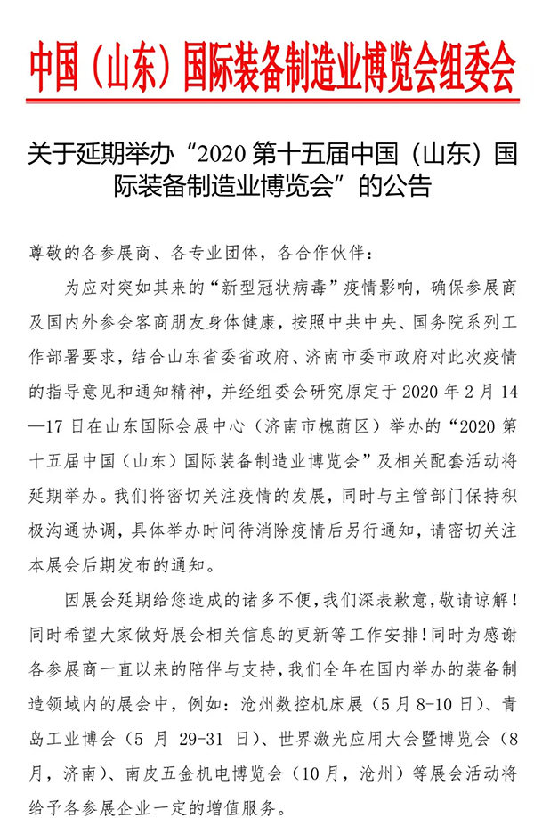 【公告】2020第十五屆中國(山東)國際裝備制造業(yè)博覽會延期舉辦