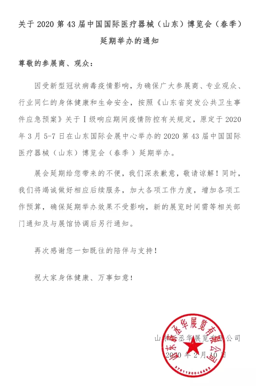 關(guān)于2020第43屆中國(guó)國(guó)際醫(yī)療器械(山東)博覽會(huì)延期的通知