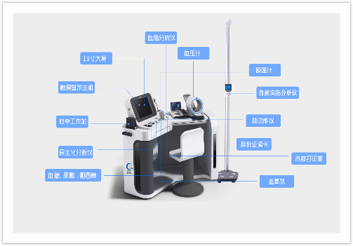 健康驛站配置身高體脂分析儀、額溫計、全自動血壓計、血氧儀、血脂分析儀、尿液分析儀、心電、肺功能儀、血糖尿酸膽固醇檢測儀等醫(yī)療檢測設備。社區(qū)居民可自助檢測血壓、血氧、血糖、總膽固醇、尿酸、脈搏、心率、肺功能、身高體重、體溫、BIM等體征數(shù)據(jù),還可在醫(yī)生協(xié)助下完成12導聯(lián)心電檢查、尿生化檢查等常規(guī)項目。