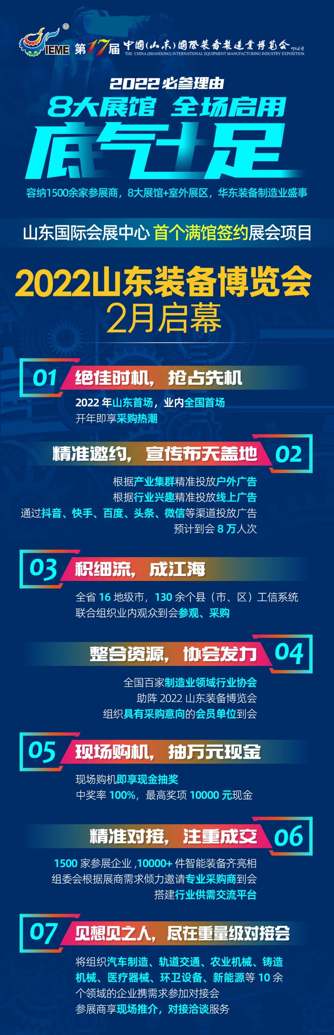 由中國機械工業(yè)聯合會、山東省工業(yè)和信息化研究院主辦、濟南市機器人與高端裝備產業(yè)協會、山東新丞華展覽有限公司承辦的2022第十七屆中國(山東)國際裝備制造業(yè)博覽會定于2022年2月25-28日在山東國際會展中心舉辦,主要展示數控機床、激光切割、工業(yè)自動化、工業(yè)機器人、智能裝備、功能部件等方面的最新技術及產品。本屆展會開設8大展館,面積將超過10萬平方米,匯聚1500家知名展商。展會全力推進高端裝備發(fā)展,助力制造強國建設。打造年度山東首個規(guī)模大、質量高、影響力強的行業(yè)大展。