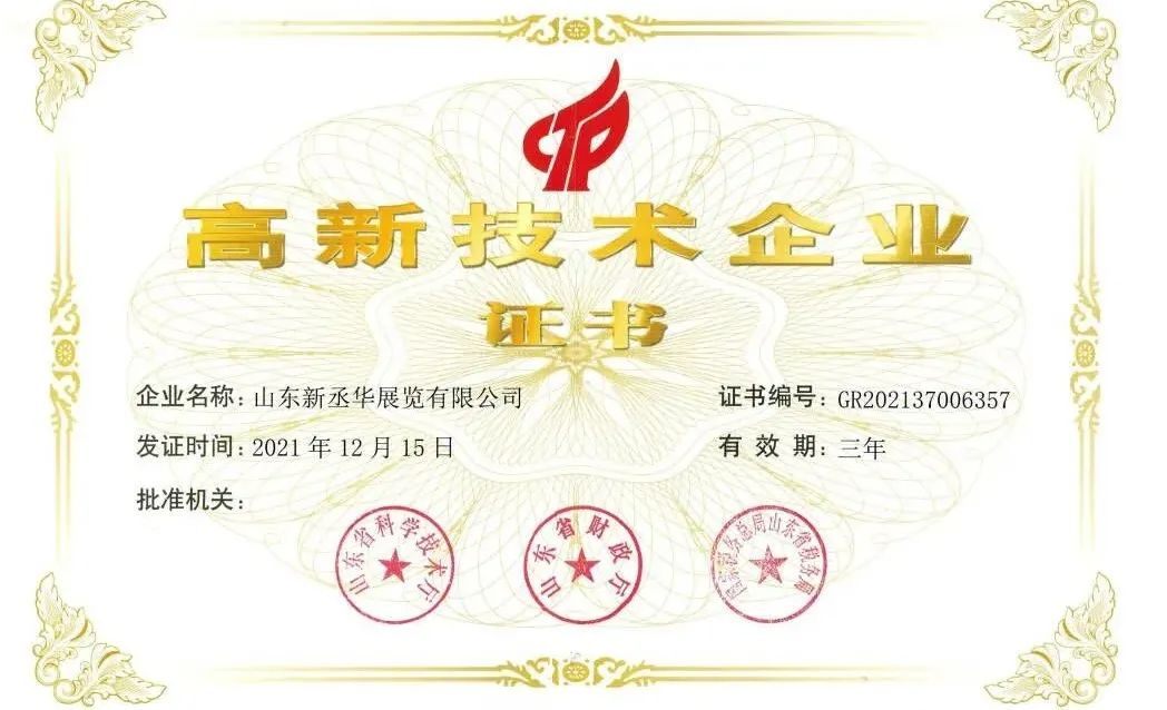 在2021年12月,全國高新技術企業(yè)認定管理工作領導小組辦公室就已公示了山東省認定管理機構2021年認定的第二批高新技術企業(yè)備案名單,山東新丞華展覽限公司榮登榜單。