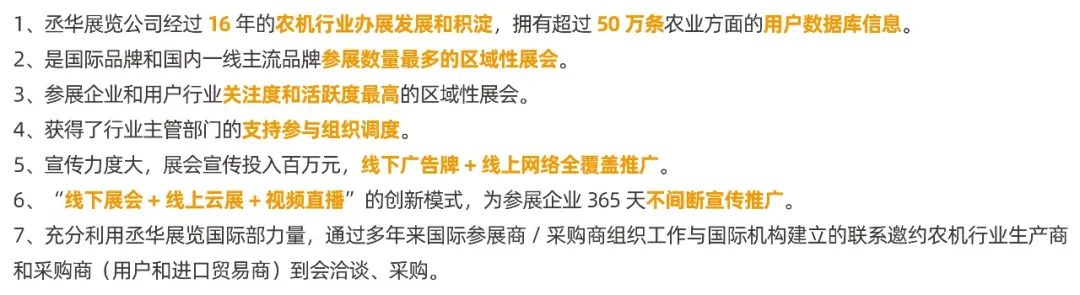 山東農(nóng)機(jī)展現(xiàn)已同包括聯(lián)合國可持續(xù)農(nóng)業(yè)機(jī)械化發(fā)展中心(CSAM)在內(nèi)的近30個海外國家的近40個農(nóng)業(yè)部門和協(xié)會機(jī)構(gòu)建立聯(lián)系或合作,如日本十勝農(nóng)機(jī)協(xié)會、俄羅斯農(nóng)機(jī)制造協(xié)會、俄羅斯亞洲企業(yè)家協(xié)會、俄羅斯亞洲商務(wù)中心、俄中機(jī)電商會、俄羅斯克拉斯諾達(dá)爾邊疆區(qū)農(nóng)業(yè)工業(yè)部、烏克蘭工商會、印度農(nóng)機(jī)制造商協(xié)會(AMMA)、伊朗農(nóng)機(jī)協(xié)會(ATMAK)、斯里蘭卡農(nóng)機(jī)協(xié)會、尼泊爾農(nóng)業(yè)部農(nóng)業(yè)工程局、尼泊爾農(nóng)機(jī)制造企業(yè)家協(xié)會、老撾工商會、緬甸農(nóng)機(jī)司、柬埔寨農(nóng)機(jī)協(xié)會、越南農(nóng)機(jī)與電氣化司、孟加拉國農(nóng)機(jī)制造商協(xié)會、斯里蘭卡農(nóng)機(jī)協(xié)會、馬來西亞農(nóng)機(jī)裝備協(xié)會、泰國農(nóng)業(yè)和合作社部、泰國農(nóng)機(jī)企業(yè)俱樂部、蒙古工商會、哈薩克斯坦中國貿(mào)易促進(jìn)會、哈薩克斯坦裝備制造商協(xié)會、坦桑尼亞商業(yè)工業(yè)農(nóng)業(yè)商會等。這些機(jī)構(gòu)高度認(rèn)同山東農(nóng)機(jī)展在促進(jìn)行業(yè)市場對接、增進(jìn)中外農(nóng)機(jī)產(chǎn)業(yè)的交流與合作所做的工作,每年有近20個國家的行業(yè)組織組織本國農(nóng)機(jī)專家、農(nóng)機(jī)企業(yè)和進(jìn)口商、經(jīng)銷商到會參觀。