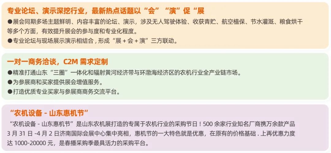 山東省實(shí)施鄉(xiāng)村振興發(fā)展戰(zhàn)略,為農(nóng)業(yè)農(nóng)村現(xiàn)代化提供機(jī)械裝備支撐,打造鄉(xiāng)村振興“齊魯樣板”,大力扶持農(nóng)機(jī)科研創(chuàng)新,推進(jìn)農(nóng)機(jī)產(chǎn)業(yè)“產(chǎn)學(xué)研”一體化發(fā)展。依托產(chǎn)業(yè)優(yōu)勢,“山東農(nóng)機(jī)展”常設(shè)動力機(jī)械展區(qū)、收獲機(jī)械展區(qū)、農(nóng)業(yè)運(yùn)輸車輛、節(jié)水灌溉、糧食烘干等12大展區(qū),展示內(nèi)容將涵蓋農(nóng)業(yè)生產(chǎn)從種子生產(chǎn)、耕整地、種植、田間管理、收獲加工、秸稈利用的全過程,覆蓋糧食生產(chǎn)全產(chǎn)業(yè)鏈機(jī)械,已成為農(nóng)機(jī)領(lǐng)域國際合作的一個業(yè)務(wù)洽談、項(xiàng)目投資、技術(shù)合作的交流新平臺。歷屆展會品牌企業(yè)云集,高端裝備匯聚,約翰迪爾、凱斯紐荷蘭、馬斯奇奧、美國愛科、道依茨法爾等國際知名企業(yè)集中亮相,中國一拖、濰柴雷沃、中聯(lián)重科、深圳大疆等國內(nèi)一線品牌悉數(shù)到場,山東金大豐、國豐、山拖凱泰等兗州重點(diǎn)企業(yè)開設(shè)專場。累計(jì)展示1500家農(nóng)機(jī)企業(yè)、20000余臺大型、智能、高端農(nóng)機(jī)裝備產(chǎn)品,全面體現(xiàn)國內(nèi)乃至世界農(nóng)機(jī)裝備水平。