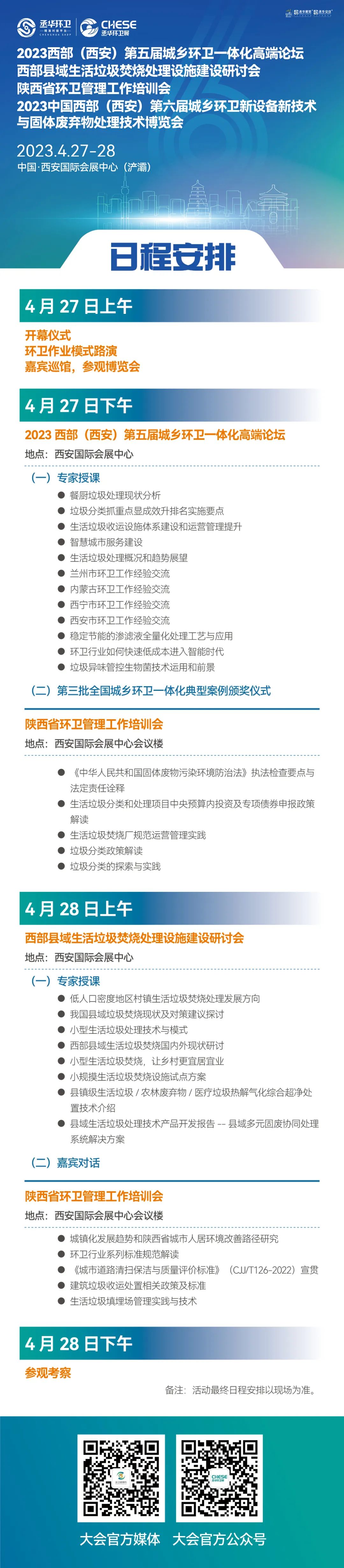 2023西部(西安)第五屆城鄉(xiāng)環(huán)衛(wèi)一體化高端論壇、西部縣域生活垃圾焚燒處理設(shè)施建設(shè)研討會及陜西省環(huán)衛(wèi)管理工作培訓會各有側(cè)重,邀請政府部門領(lǐng)導、知名專家學者、品牌企業(yè)大咖等共同參與,以專家授課、嘉賓對話、城市交流等多種形式,助推西部地區(qū)環(huán)衛(wèi)行業(yè)新發(fā)展!應(yīng)廣大參會代表和觀眾要求,現(xiàn)就整體活動初步日程安排進行公布,歡迎了解!