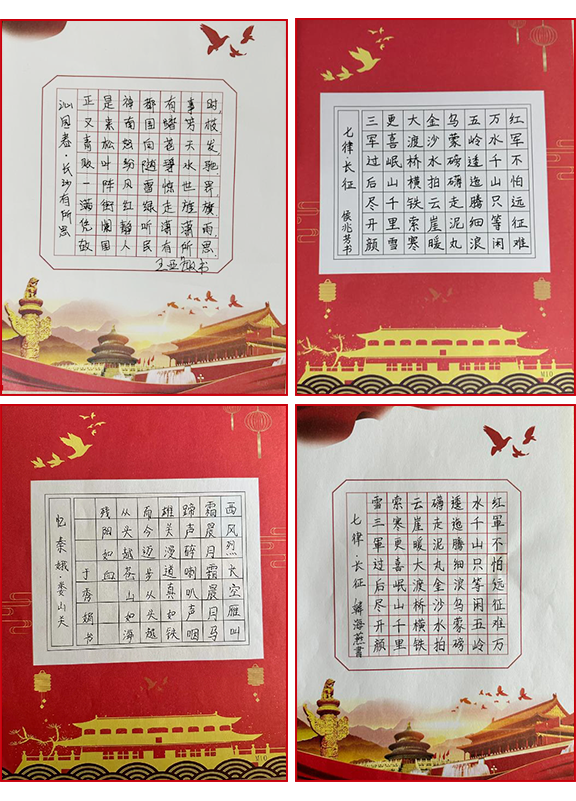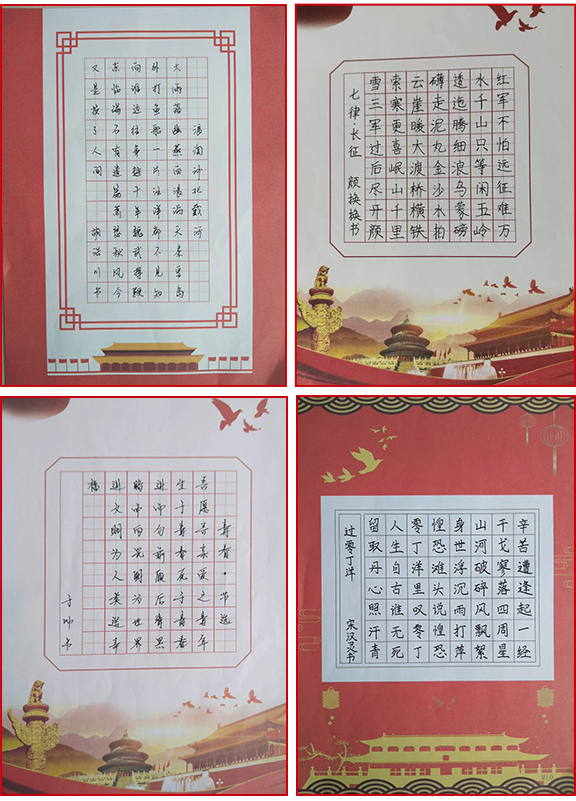 以史為鑒,可知興替;以詩為馬,莫負(fù)韶華。本次參加活動的黨員們用堅(jiān)定的筆觸,澎湃的心情重溫革命語錄、抄寫紅色詩詞,字里行間深切地感受黨的光輝發(fā)展歷程。書寫的作品結(jié)構(gòu)均勻,筆畫流暢,橫平豎直整齊美觀,落筆之處或輕或重,或緩或急,橫、豎、撇、捺、點(diǎn)間,可以看出大家的認(rèn)真態(tài)度。“紅軍不怕遠(yuǎn)征難,萬水千山只等閑”、“雄心寫壯志,和諧奔復(fù)興”、“漫天風(fēng)雪滿天愁,革命何須怕斷頭”、“雄關(guān)漫道真如鐵,而今邁步從頭越”……從一篇篇的抄錄作品中,我們仿佛又看到了中國共產(chǎn)黨那段艱苦卓絕的奮斗歷程,體會了革命先烈不屈不撓、英勇頑強(qiáng)的大無畏氣概。